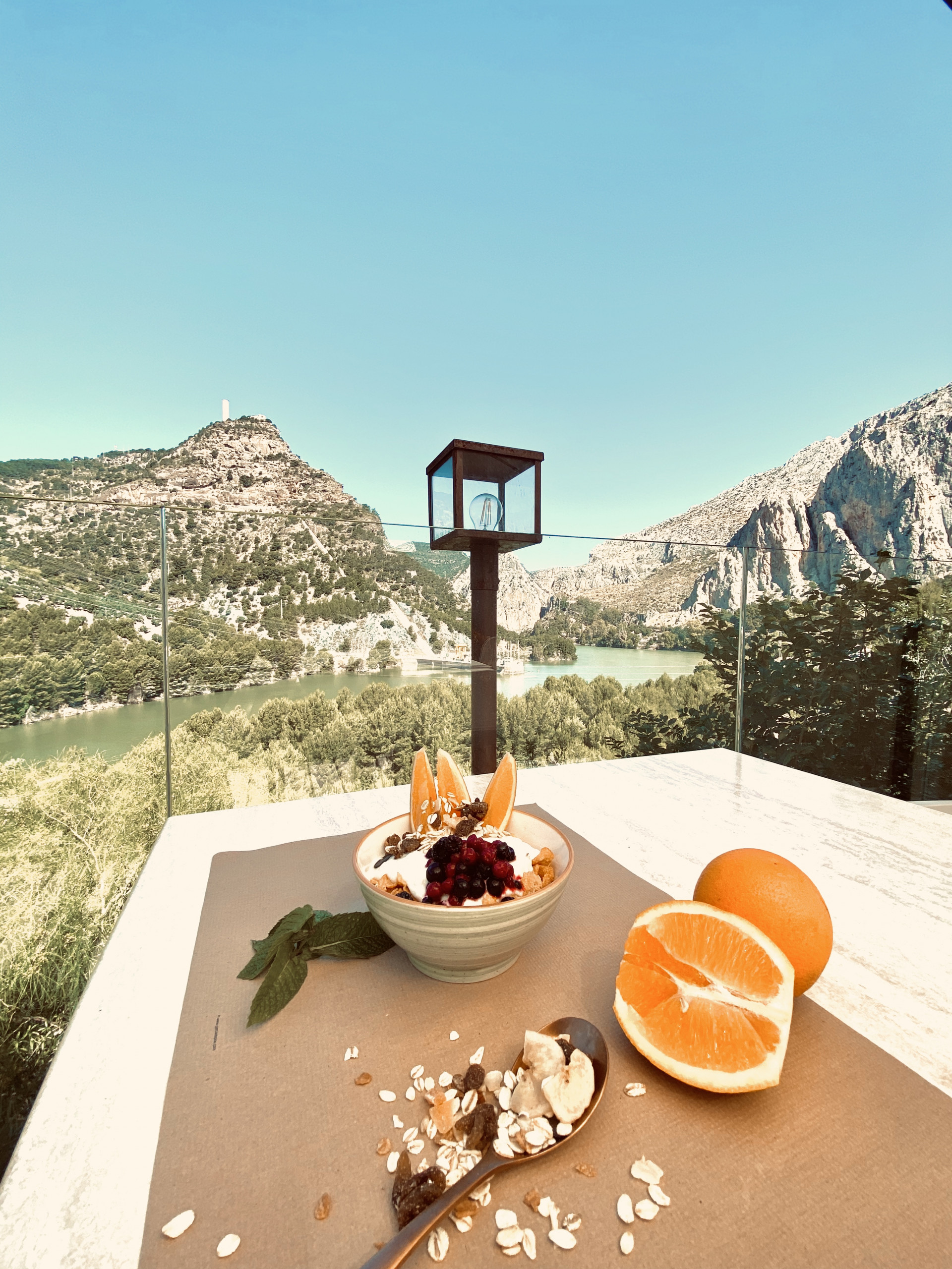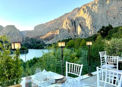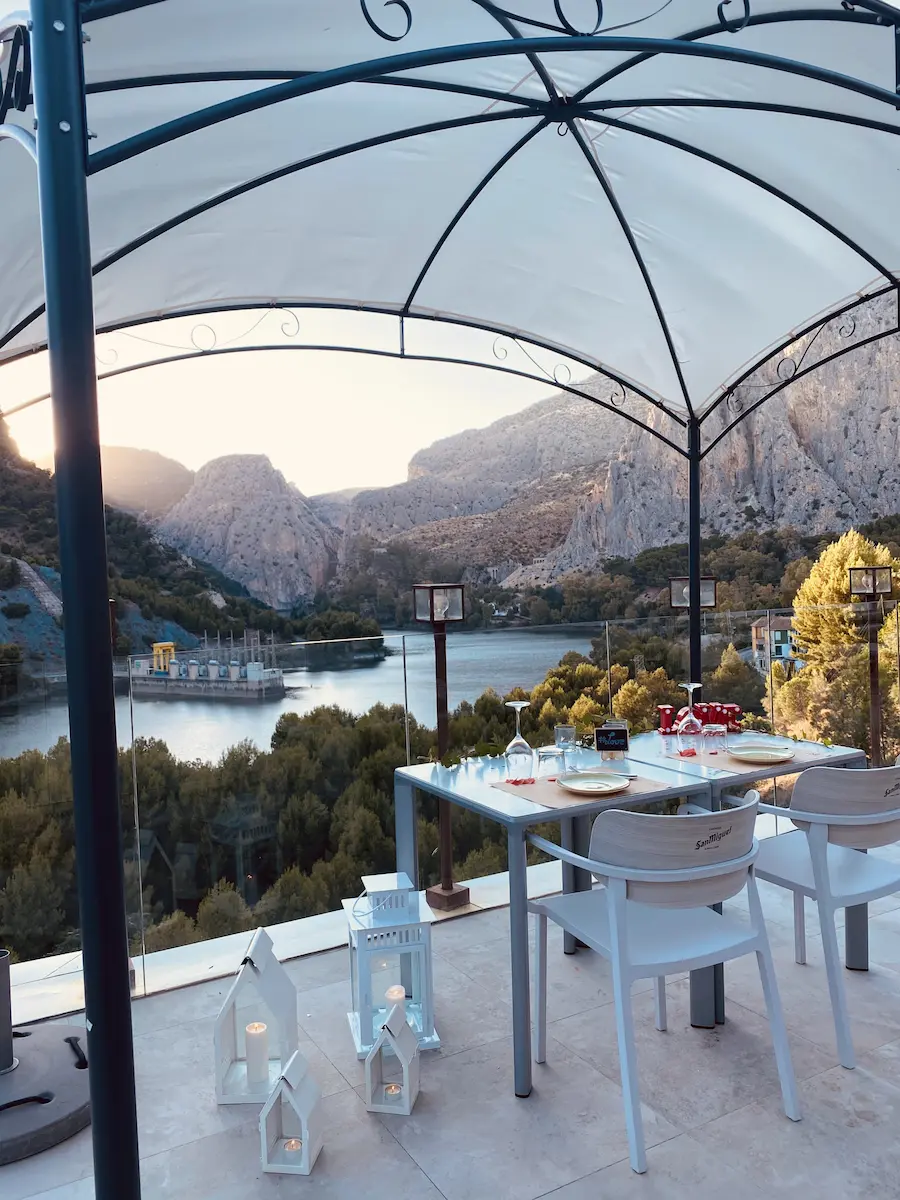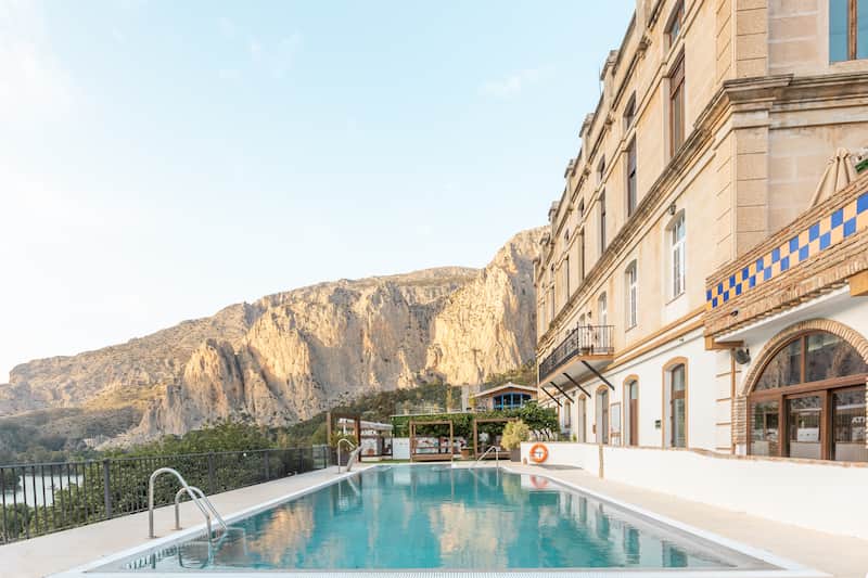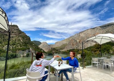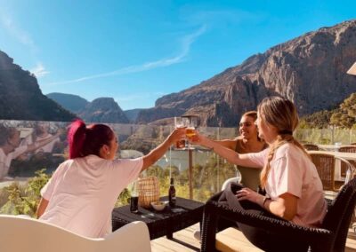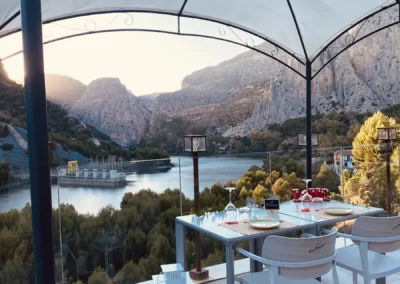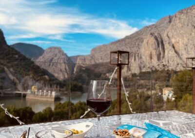 Piscina exterior panorámica con hidromasaje y vistas privilegiadas al Caminito del Rey. Disfruta de un cocktail y déjate llevar por la agradable sensación de relax que experimentarás al entrar en nuestras instalaciones. Un pequeño lujo al alcance exclusivo de nuestros huéspedes.