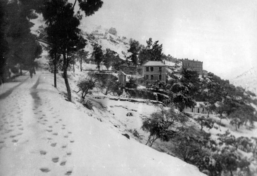 Imagen de la carretera de la central Hidroeléctrica a la estación del ferrocarril del Chorro durante la nevada de febrero de 1954. Al fondo el imponente edificio de la fábrica de harina Santa Mariana, hoy complejo turístico “La Garganta”. En el centro de la foto el edificio que hoy alberga el bar “Caminito”, perteneciente al mismo complejo.