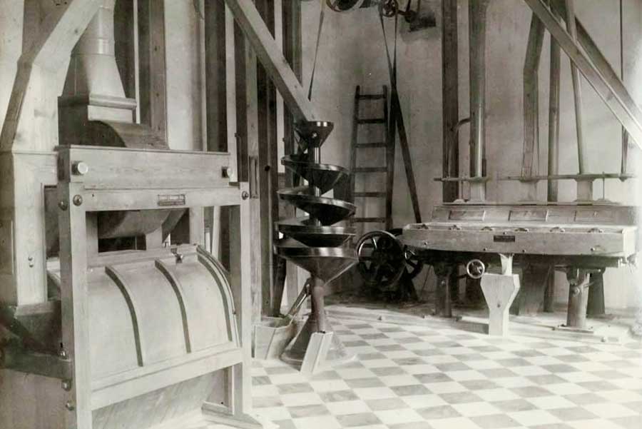 Imagen de la maquinaria del interior de una fábrica de harinas, similar a la de Santa Mariana, de primeros del siglo XX.